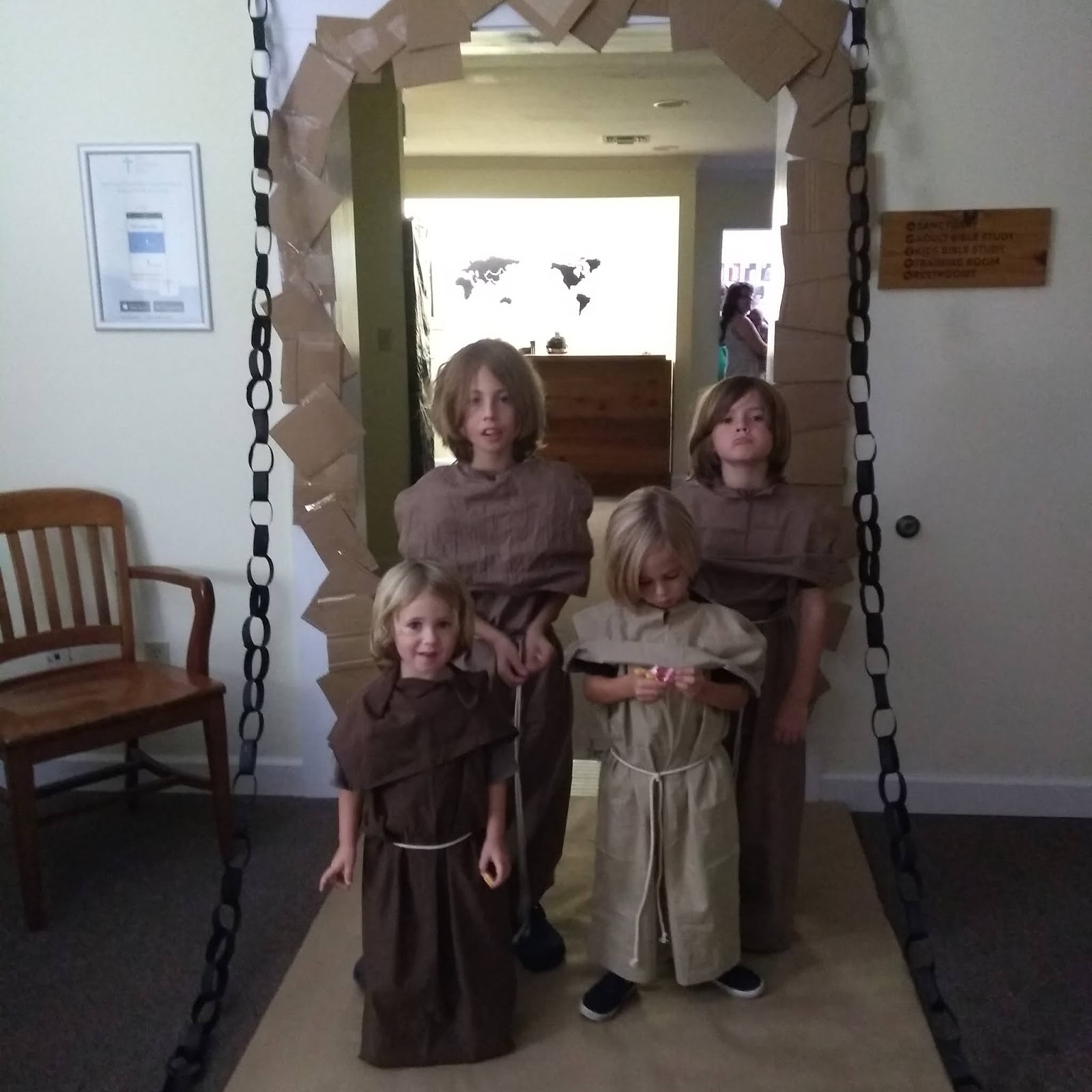 | Sewing monk outfits out of pillow cases for Reformation day |